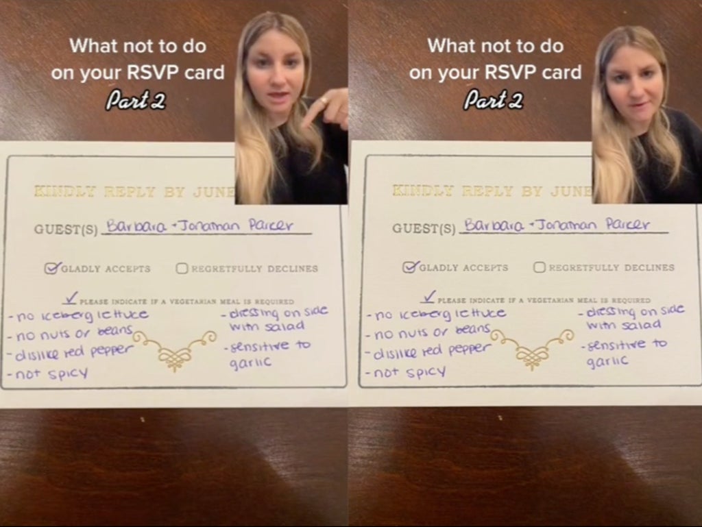 Toronto-based TikToker Melissa Baum, who goes by @melissabaumevents on the app, went viral when she posted a video of a wedding guest’s response to her wedding invitation. The RSVP card asked guests to write down their name, check off whether they’re attending, and if they require a vegetarian meal. However, this person went the extra mile by writing down all of their food preferences and dislikes for the event.