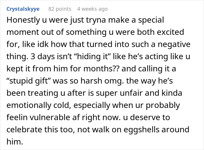 This dad-to-be got mad at his wife when she broke the news during his birthday. After receiving the positive pregnancy test as a birthday gift, he blew up at his wife, calling the present “stupid” and asking why she didn’t tell him right away. At a loss, the wife turned to the internet for advice.