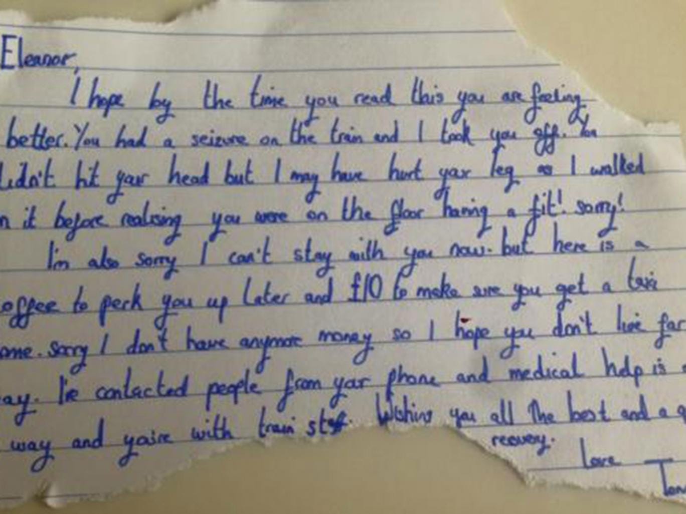 She came around on the floor to find the coffee, a £10 note and the handwritten letter from a man giving his name only as Tom.