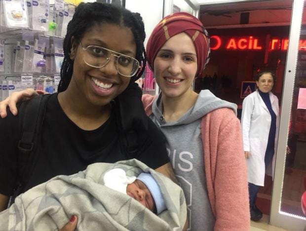 Tia Freeman was travelling from the US to Germany to go on holiday when she started suffering contractions as she landed in Istanbul for a stopover in March.