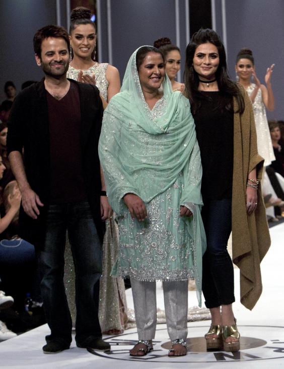 On Tuesday night, surrounded by Pakistan's top models and wealthy designers, Mai appeared slightly shy and nervous when faced with the blitz of cameras. Mai, now 44, wore a light green embroidered bridal shirt and silver, silk pajama pants, designed by Rozina Munib, with a scarf covering her hair.