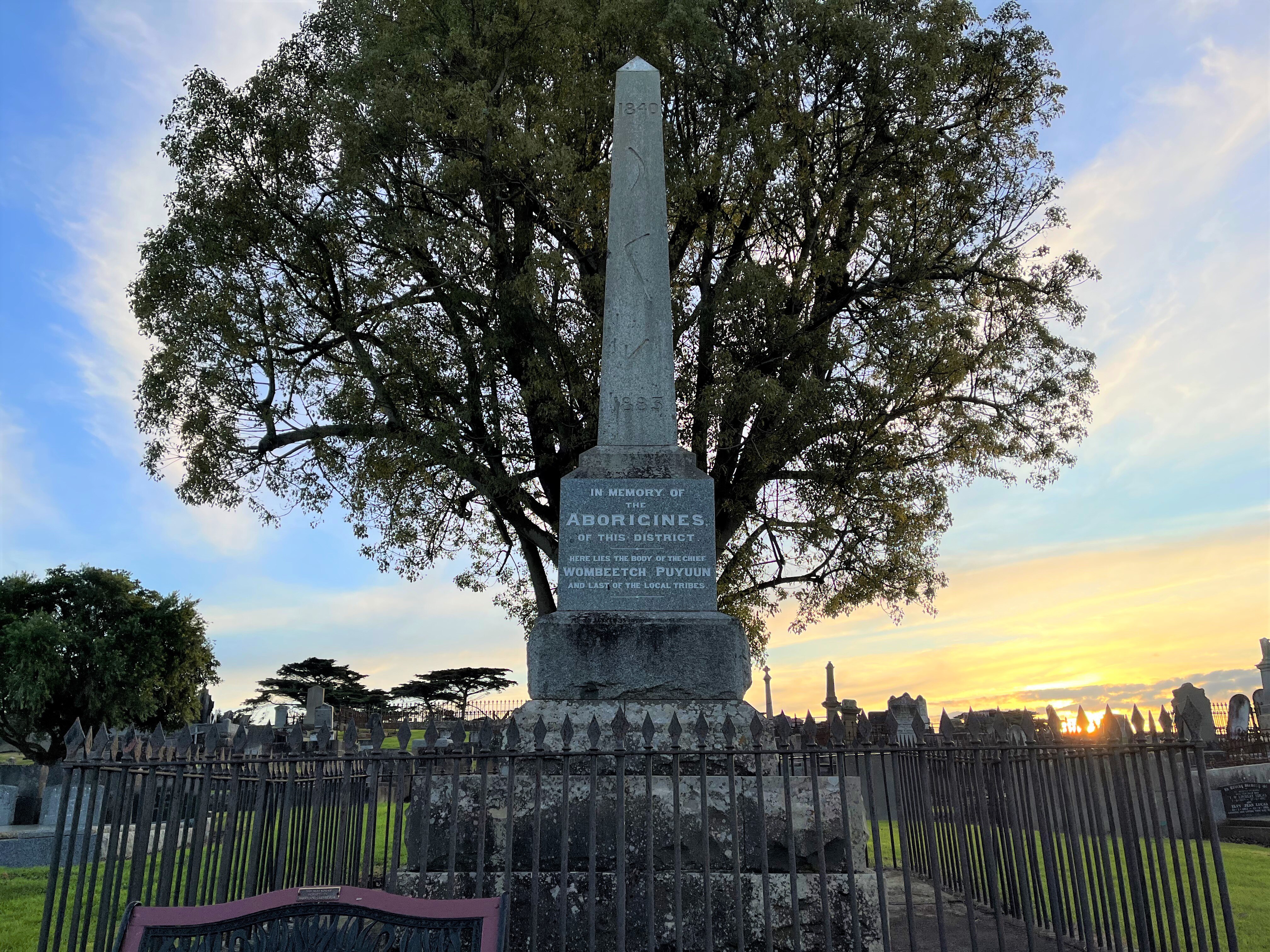 "In memory of the Aborigines of the district. Here lies the body of the chief Wombeetch Puyuun and the last of the local tribes."