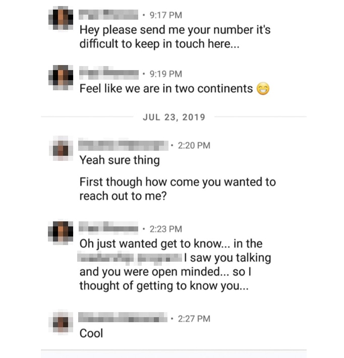 In 2019, she connected with someone on the social media platform through the "find nearby" option during a university networking event with the intention of building her professional connections.