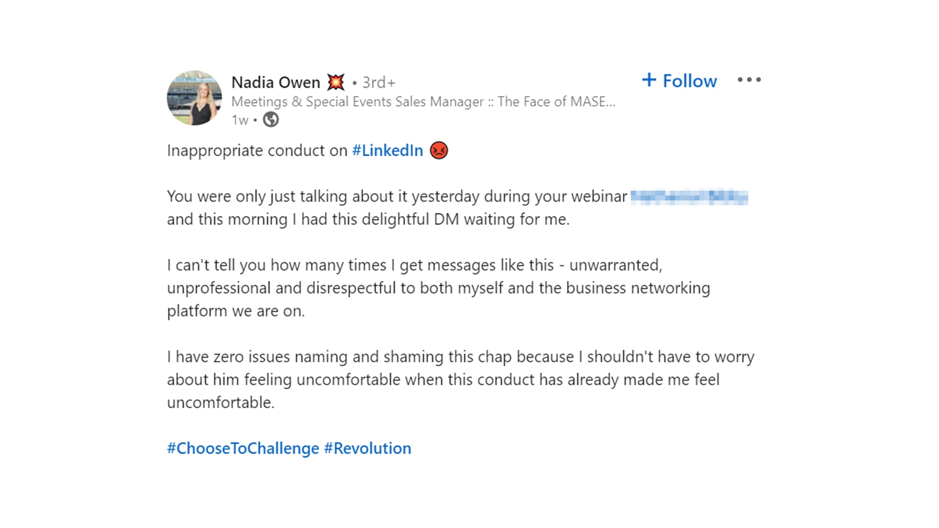 "It has happened many times before on LinkedIn, and they can vary from seemingly harmless comments about your looks to full-blown incredibly disgusting photos or sentences or suggestive word usage," she said.