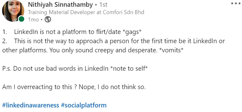 "I wanted to post this experience to create an awareness that LinkedIn is a professional network and one should not misuse it," Ms Sinnathamby said.