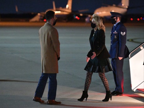 On Thursday, after playing an April Fool’s Day joke on the staff and reporters aboard Air Force One, Dr Biden stepped off the plane in an entirely black outfit, which included a pair of heeled black booties, a leather skirt and a black blazer, which she completed with a pair of black fishnet-esque stockings.