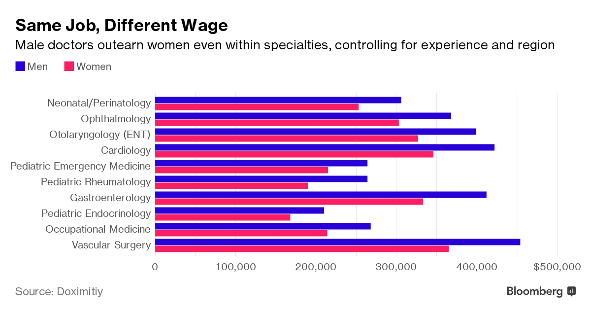 The doctor wage gap is well-documented, with some studies finding that male doctors make almost 40 percent more than female doctors. One common explanation has been that women go into lower-paying fields, such as primary care and pediatrics. The Doximity survey appears to refute that suggestion.