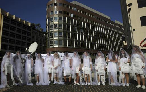 On Tuesday, around a dozen women wearing white dresses and bandages stained with fake blood staged a demonstration outside the government building in downtown Beirut to signify their support for changing the archaic law.
