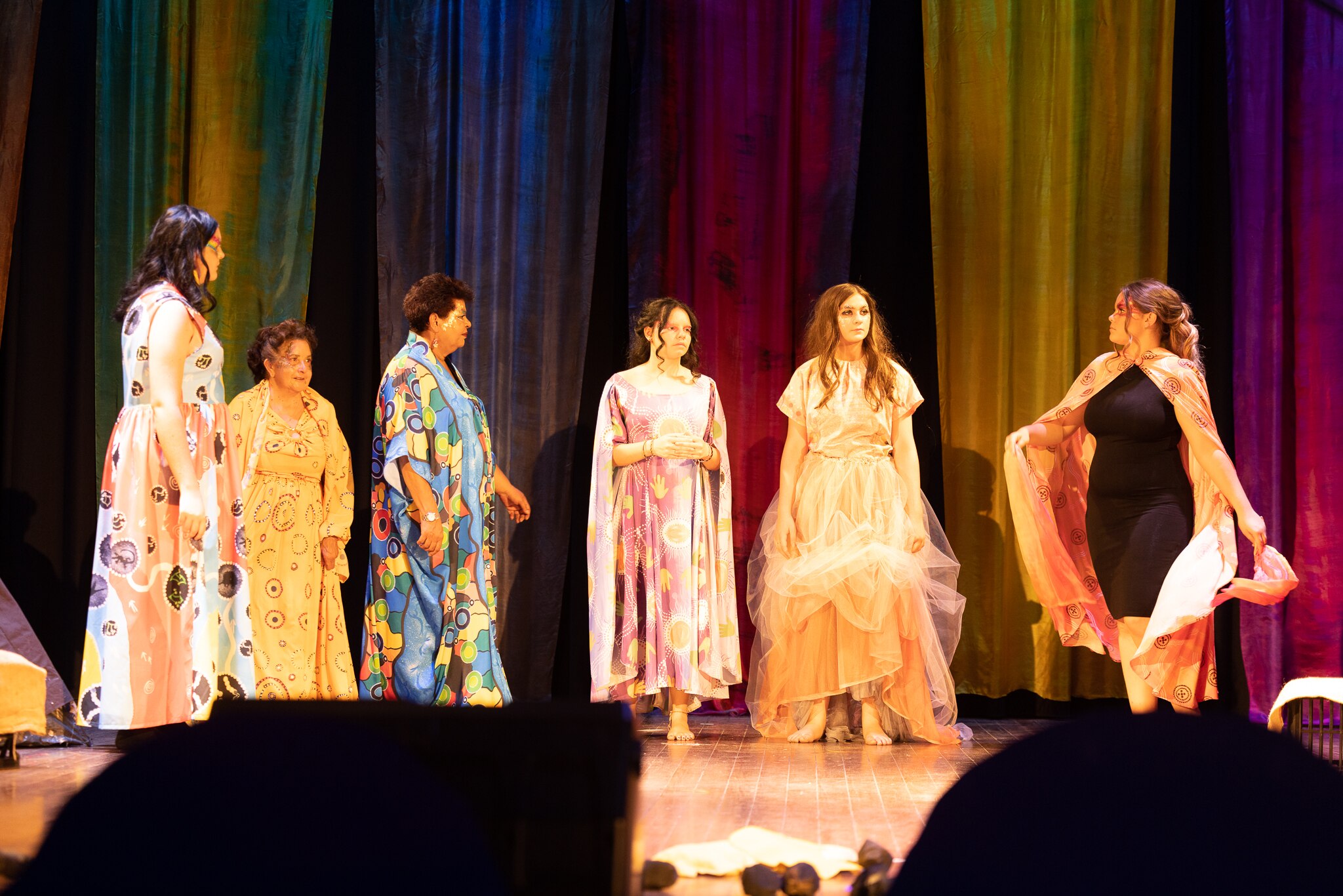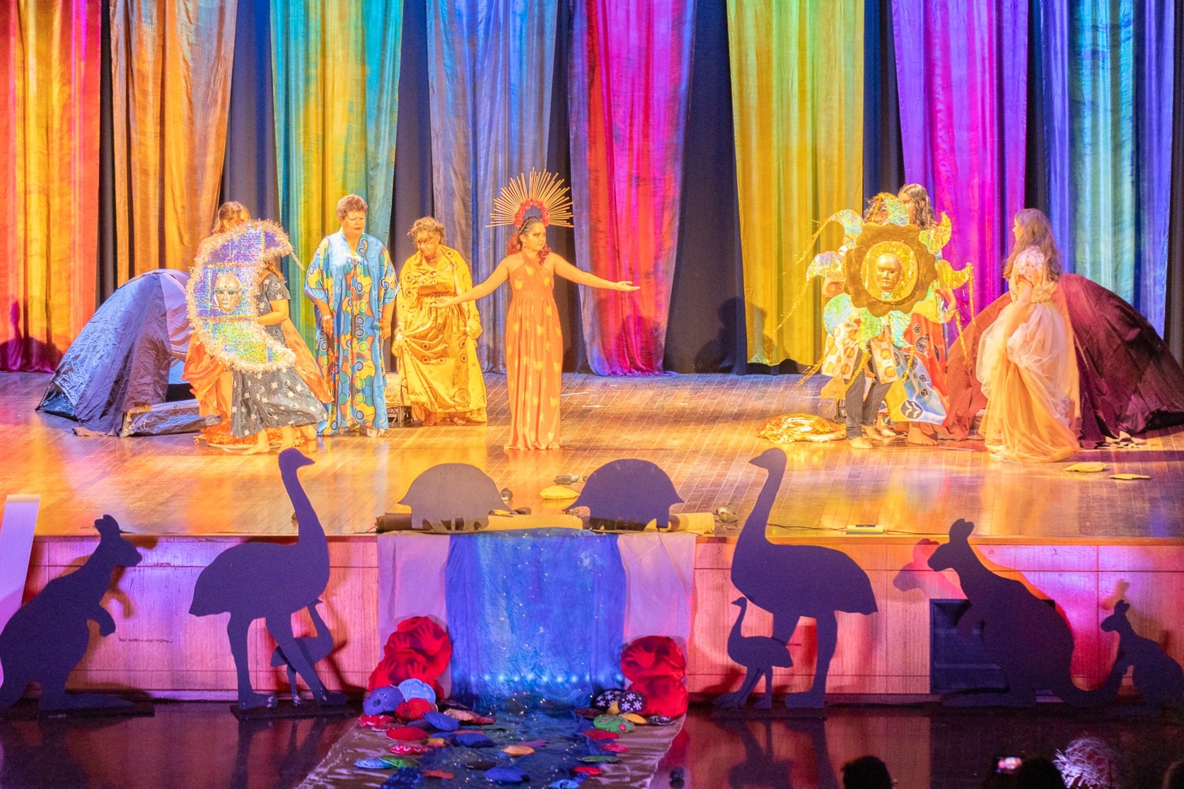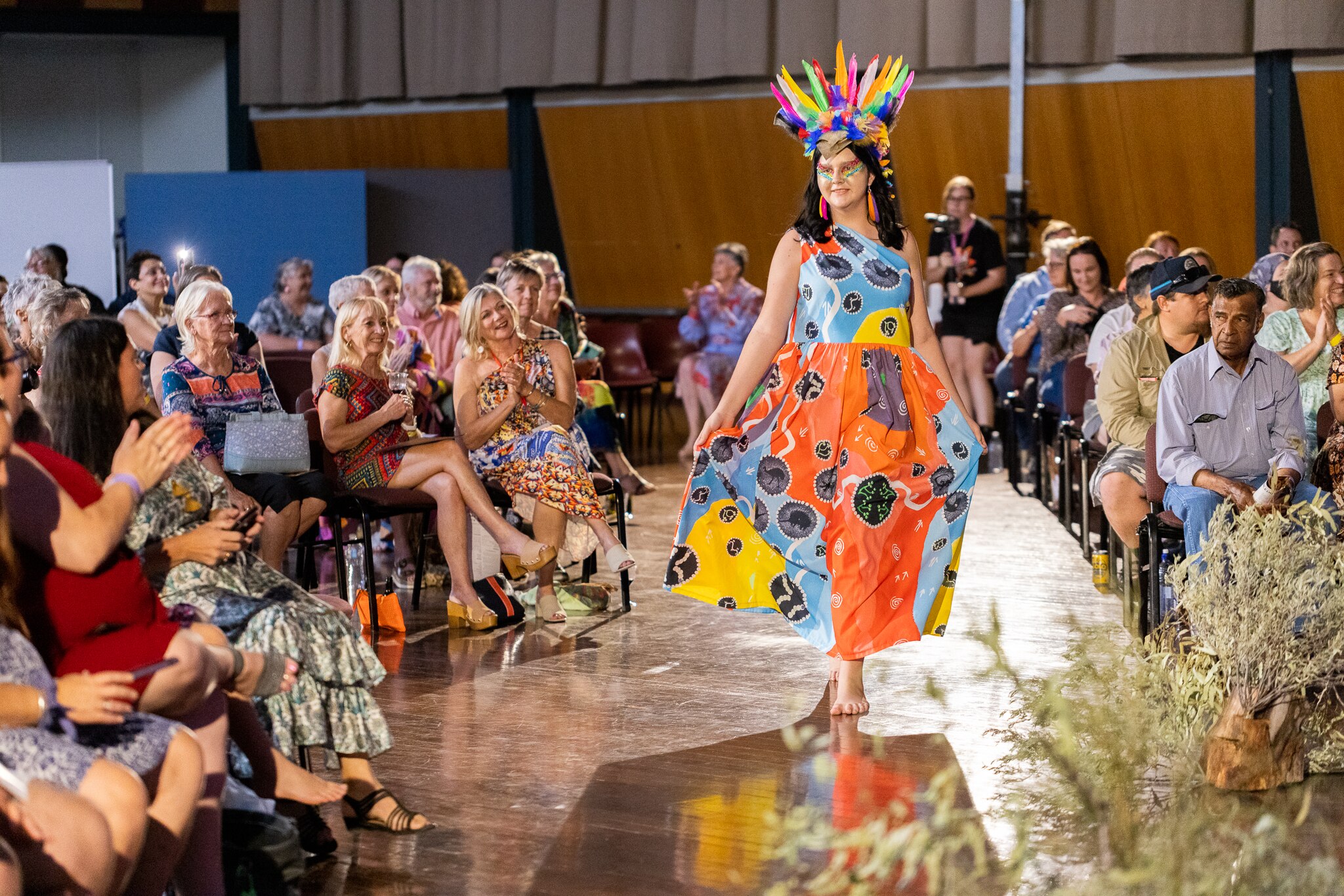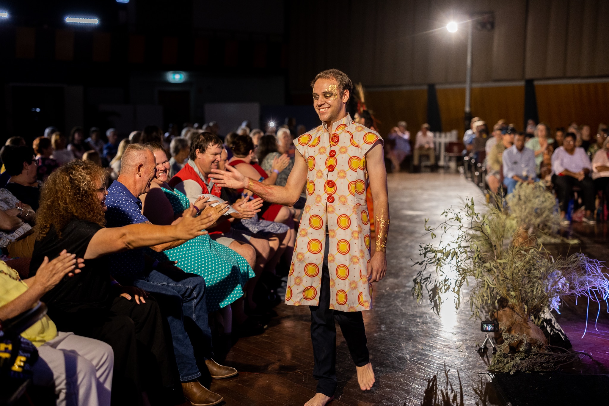 Vibrant garments worn during the performance were printed with designs transposed from canvas paintings by First Nations women of Central Western Queensland.