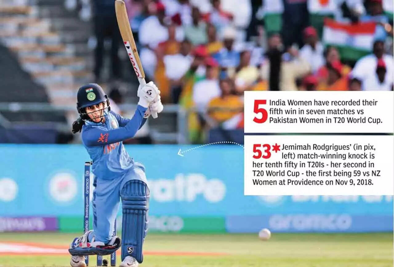 A high-scoring match, maximum pressure and a form that has been wavering for a while. But none of it affected Jemimah Rodrigues. She heard no noise, spoke to herself and showcased nerves of steel as she helped India thump Pakistan by seven wickets in their Women's T20 World Cup opener on Sunday. This was India's highest-ever successful chase in T20 cricket.