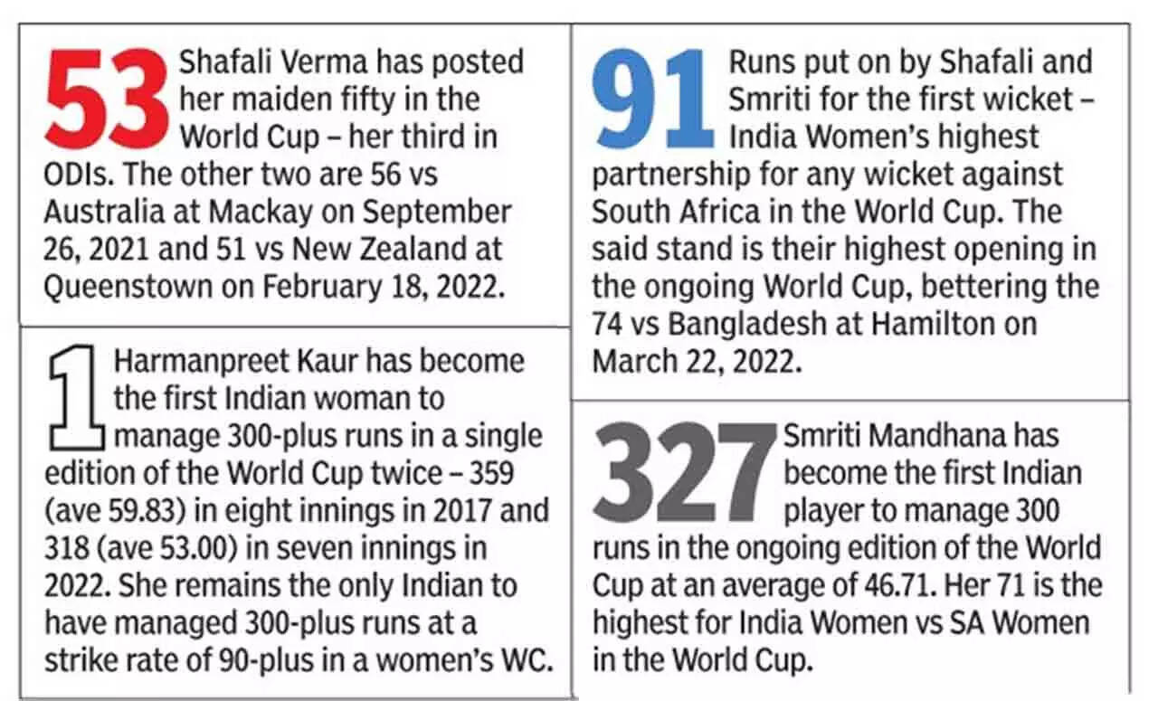 Earlier, Smriti and Shafali gave India a solid start, blunting the South African attack with their stroke-filled association of 91 runs. Yastika Bhatia made a quick exit, but Mithali, playing her last match, steadied the innings with her 84-ball 68 (8x4). With Smriti, she put up 90 runs for the third wicket. Pacer Masabata Klass broke the well-settled partnership when Smriti miscued to Chloe Tryon, who dived to hold on to a difficult catch at mid-off.
