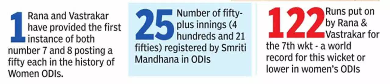 Struggling at 114/6 in the 34th over, India rode on a fine batting show from Smriti Mandana (52), Deepti Sharma (40), Sneh Rana (53 n. o, 48b, 4x4) and Pooja Vastrakar (67, 59b, 8x4) to steer India to a competitive 244/7.