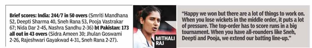 Bowlers, led by left-arm spinner Rajeshwari Gayakwad (4/31) then turned up the heat to bowl out Pakistan for 137 in 43 overs, thus handing India a handsome 107-run win. In the process, they stretched their winning streak against their rivals from across the border to 11 matches.