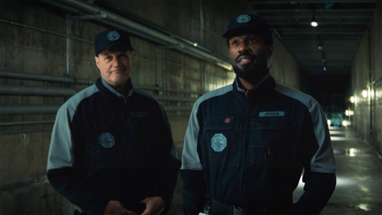 Then, somewhat bizarrely, we cut to Simon shadowing a blue collar worker called Chuck Eastman, who's apparently going to be the subject of a new biopic played by Simon. However, it soon becomes apparent that this is all a front because Chuck isn't just anybody – he's a DoDC security guard.
