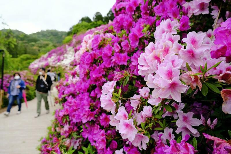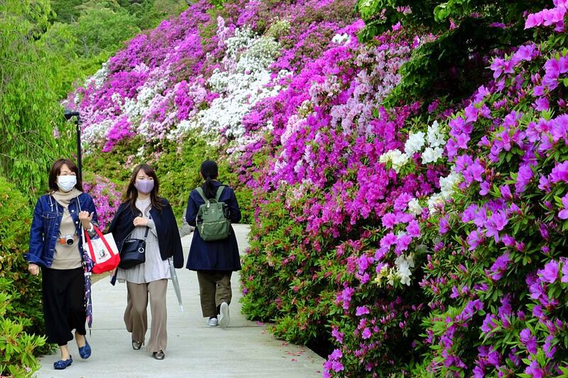 About 20,000 flowering Japanese azalea bushes are seen in full bloom at Mimuroto Temple in Uji, Kyoto. The flowers blossomed about 10 days earlier than usual this year. Mimuroto Temple used a drone to take a video of the bushes and uploaded it to their website. "Due to the pandemic, not many people can see the flowers in person," said the temple's chief priest. "I hope people can still enjoy them by watching the video." The temple grounds are open to visitors until May 16.