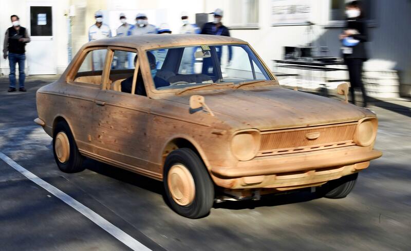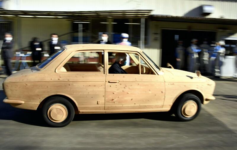 A wooden replica of Toyota Motor Corp.'s Corolla sedan was driven Saturday on the premises of Aste, a public interest incorporated foundation in Toyota, Aichi Prefecture. More than 200 Japanese cypresses harvested from forest thinning went into making it and the car's original interior, seats and design have all been meticulously reproduced.