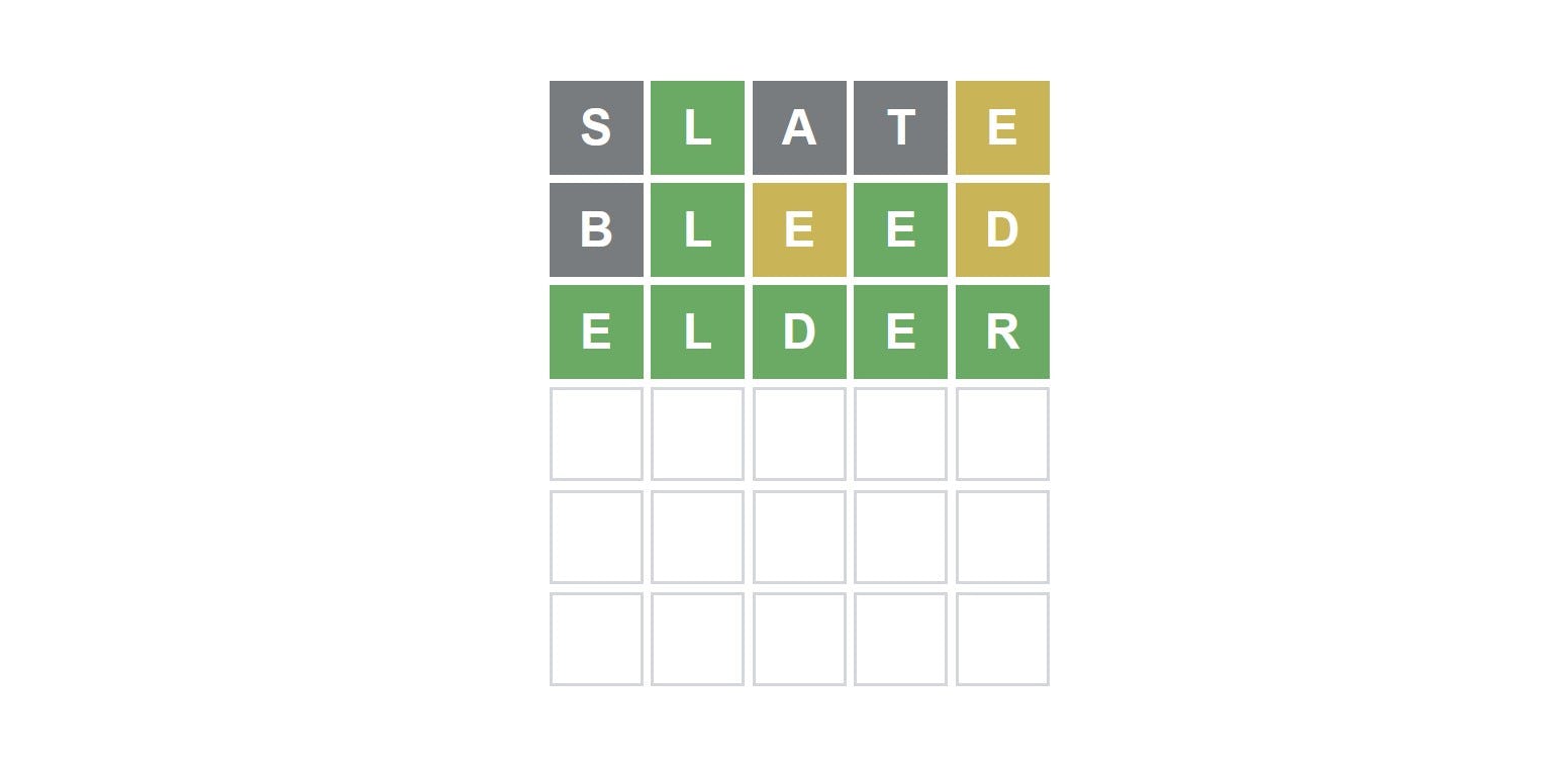 To pick apart the solution we began with our favorite starter word, SLATE, which gave us the precise location of the L and told us there was at least one E somewhere in the mix. From there we selected BLEED because it has the L in the right place and features two Es, which helped us figure out exactly where the Es in the word are located. Once the clues for BLEED showed themselves, it became a matter of unscrambling the letters to get to the proper word. Luckily, we were able to guess it.