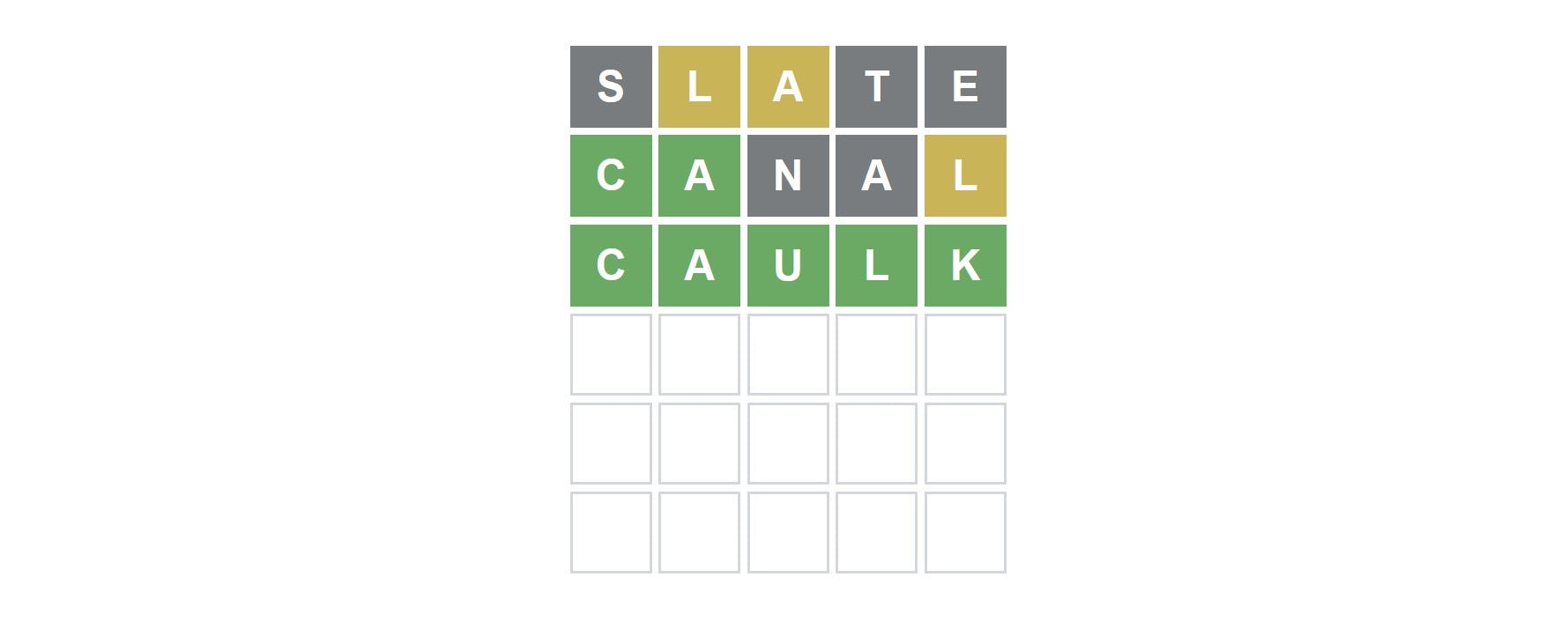 Taking a look at our own round of guesses, our traditional starter word, SLATE, proved to be pretty revealing this time around. It started us off by confirming the inclusion of L and A, which prompted us to consider CANAL. From there it took us a while to figure out where to go next, but we landed on the solution you see above.