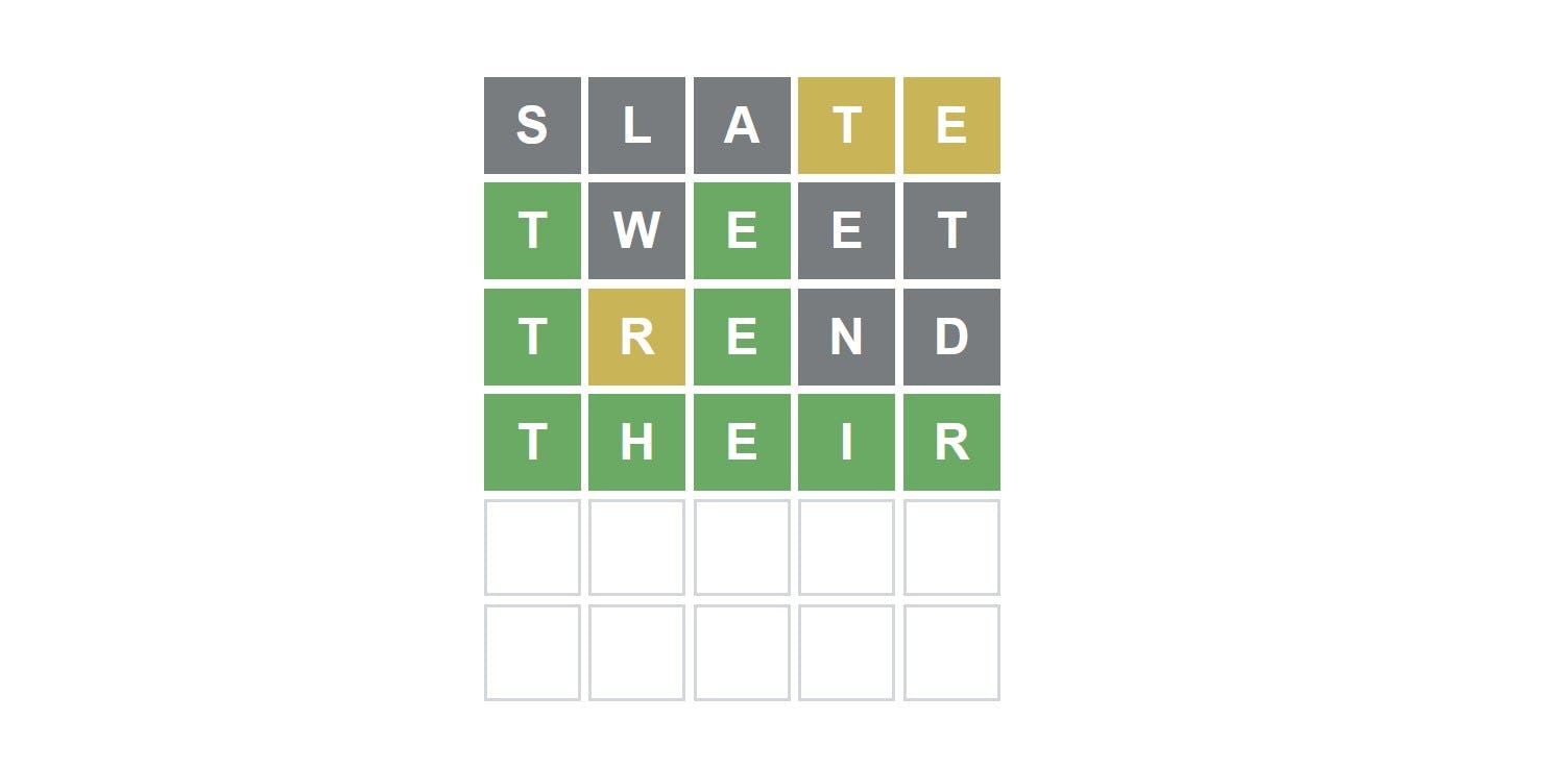 Our pattern of guesses started slow this time, with SLATE only revealing the base inclusion of T and E somewhere in the answer. That led us to go with TWEET as our second guess, which was significantly more helpful in figuring out where those letters actually reside. Our third guess, TREND, informed us of the lingering R, and that was all we needed to deduce that THEIR had to be the latest answer.