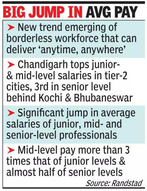 Shared exclusively with TOI, the report shows Ahmedabad has emerged strongly as one of the fastest-growing cities in the country. Among tier-2 cities, Chandigarh tops the chart in salaries paid at the junior (average CTC Rs 5.7 lakh per annum) and mid levels (Rs 13.7 lakh) — ahead of the national averages of Rs 4.4 lakh and Rs 11 lakh, respectively. Thiruvananthapuram comes a close second, with a variance of 3.5% and 1.9%, respectively.