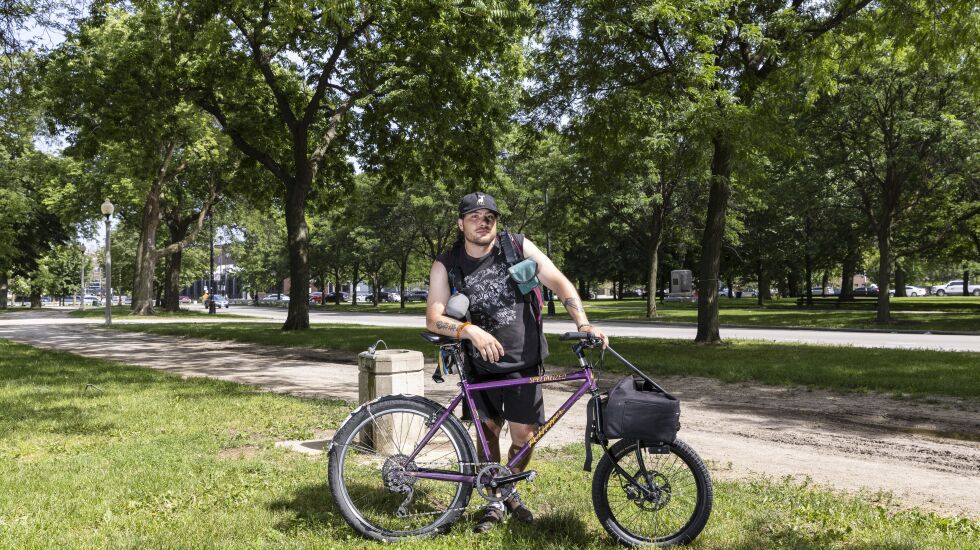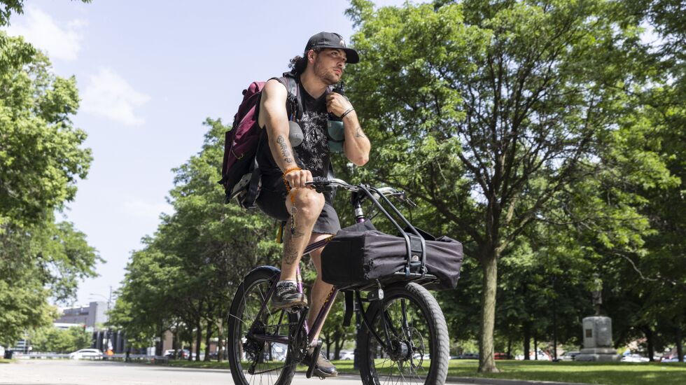 Ryan Riccio pedals between 40 and 80 miles a day on his bike making food deliveries for Snap Courier.