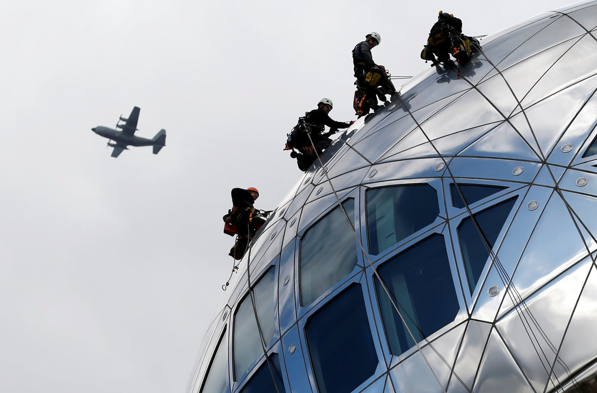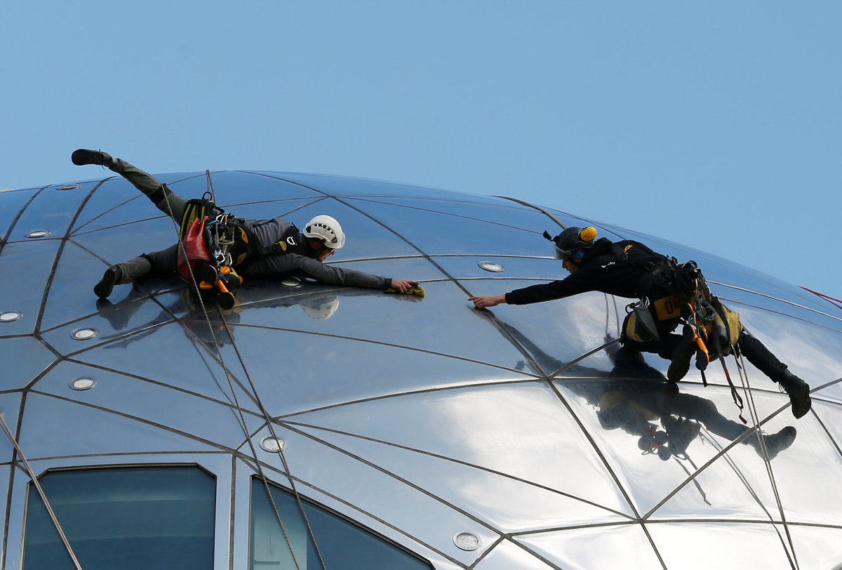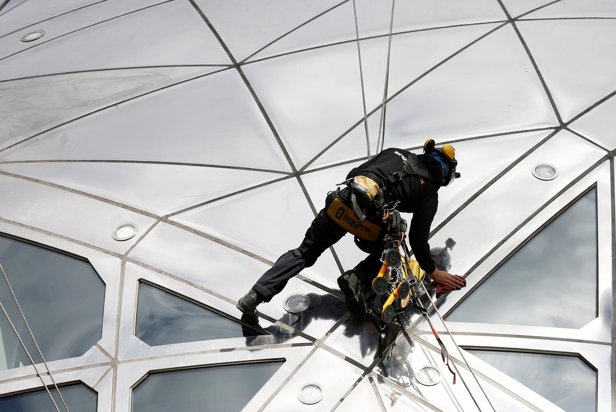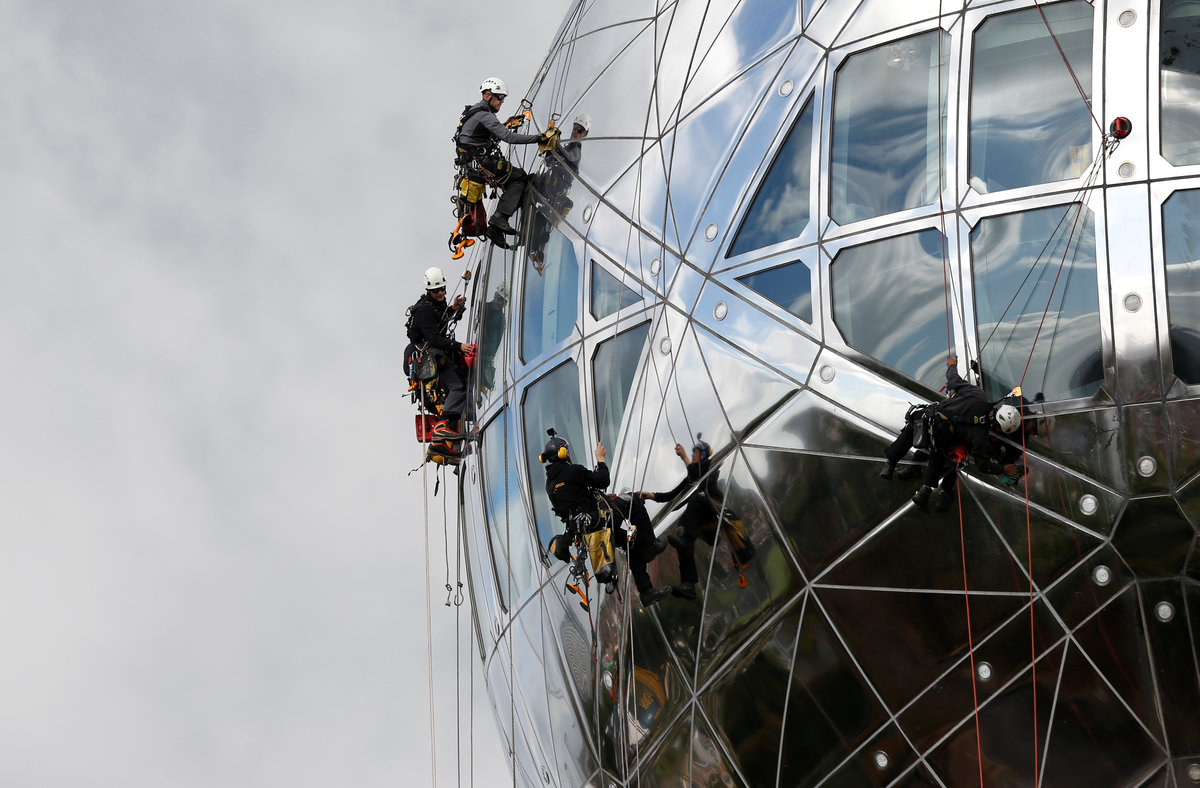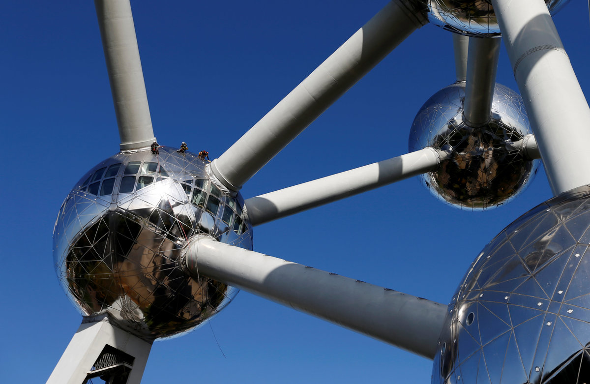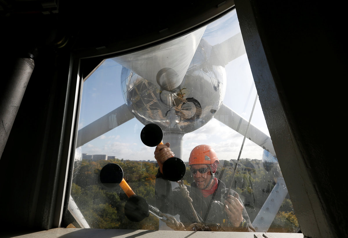Workers rappel down along one of the nine spheres of the Atomium, a 102-metre-tall (335-feet-tall) structure designed for Expo 58 in the form of a crystal of iron, during the annual cleaning of Brussels' iconic monument, Belgium October 3, 2017. REUTERS/Francois Lenoir/www.atomium.be-SABAM Belgium 2017 Workers clean one of the nine spheres of the Atomium, a 102-metre-tall (335-feet-tall) structure designed for Expo 58 in the form of a crystal of iron, during the annual cleaning of Brussels' iconic monument, Belgium October 3, 2017. REUTERS/Francois Lenoir/www.atomium.be-SABAM Belgium 2017 Workers rappel down along one of the nine spheres of the Atomium, a 102-metre-tall (335-feet-tall) structure designed for Expo 58 in the form of a crystal of iron, during the annual cleaning of Brussels' iconic monument, Belgium October 3, 2017. REUTERS/Francois Lenoir/www.atomium.be-SABAM Belgium 2017 Workers rappel down along one of the nine spheres of the Atomium, a 102-metre-tall (335-feet-tall) structure designed for Expo 58 in the form of a crystal of iron, during the annual cleaning of Brussels' iconic monument, Belgium October 3, 2017. Picture taken October 3, 2017. REUTERS/Francois Lenoir/www.atomium.be-SABAM Belgium 2017