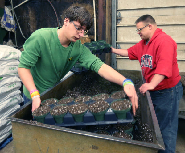 Bob Hale and Triston Young scooped planting mix from a metal bin into plastic containers, working deliberately at their task. Asked what they thought of the work, both broke into grins. "Fun," they agreed.