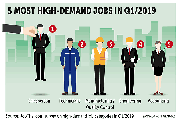 The online job search platform, JobThai, produced an analysis of job search statistics throughout the country, finding that sales, technicians, manufacturing, quality control, administration, purchasing and engineering and accounting are the five main job categories that will be the most sought-after job categories in 2019.