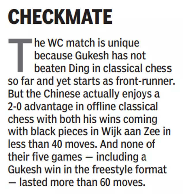 D Gukesh is being touted as favourite against reigning champion Ding Liren in the 14-game World Championship match which starts in Singapore on Monday. The Indian challenger is world No. 5 at Elo 2783 and Ding is No. 23 with Elo rating of 2728. The former is currently playing at his peak while the latter’s best rating was Elo 2816 six years ago.