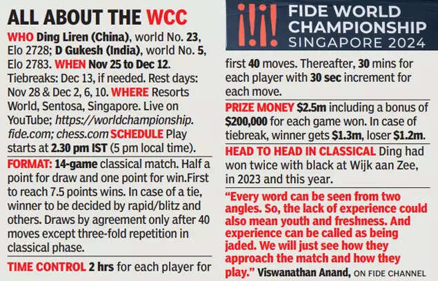 GM N Srinath, Chennai-mate of Gukesh who captained India to Olympiad gold recently, said, "Playing against a player of Ding’s class, Gukesh will of course not be able to score wins like he scores in Open events. But on the other hand, he doesn’t need to. He only requires one more win than Ding."