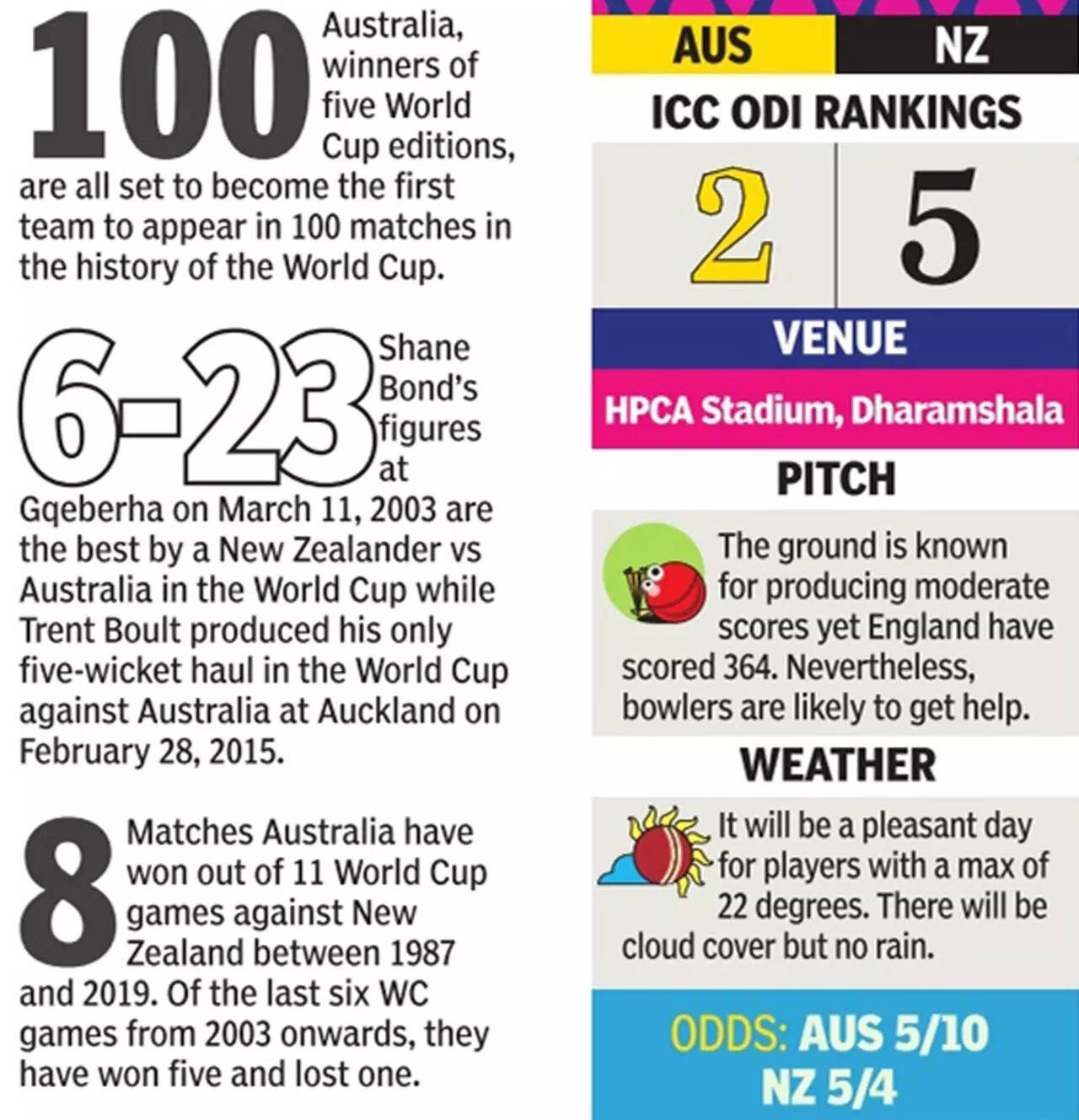 Despite New Zealand's impressive record in the competition, particularly in bilateral ODIs, Australia have historically held the upper hand in World Cup matches. With eight wins and three losses in 11 World Cup encounters, and an overall record of 95 wins and 39 losses in 141 ODIs, Australia boast a strong track record in the Trans-Tasman rivalry.
