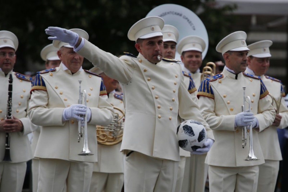 A conductor holds a ball as he directs the Presidential Band during the Changing of the Guard ceremony in Red Square in Moscow, Russia June 30, 2018. REUTERS/Sergei Karpukhin