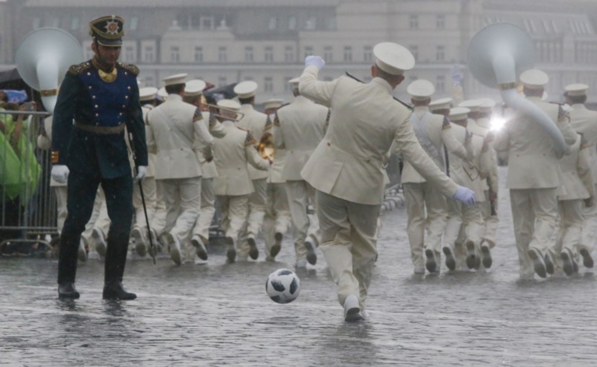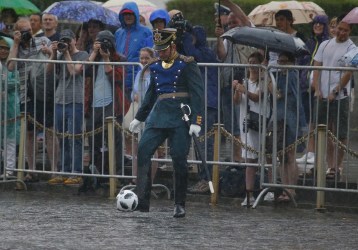 Undeterred by heavy rain, two members of the regiment in ceremonial uniform passed around a soccer ball on Red Square's cobblestones while members of the cavalry followed marching guards.