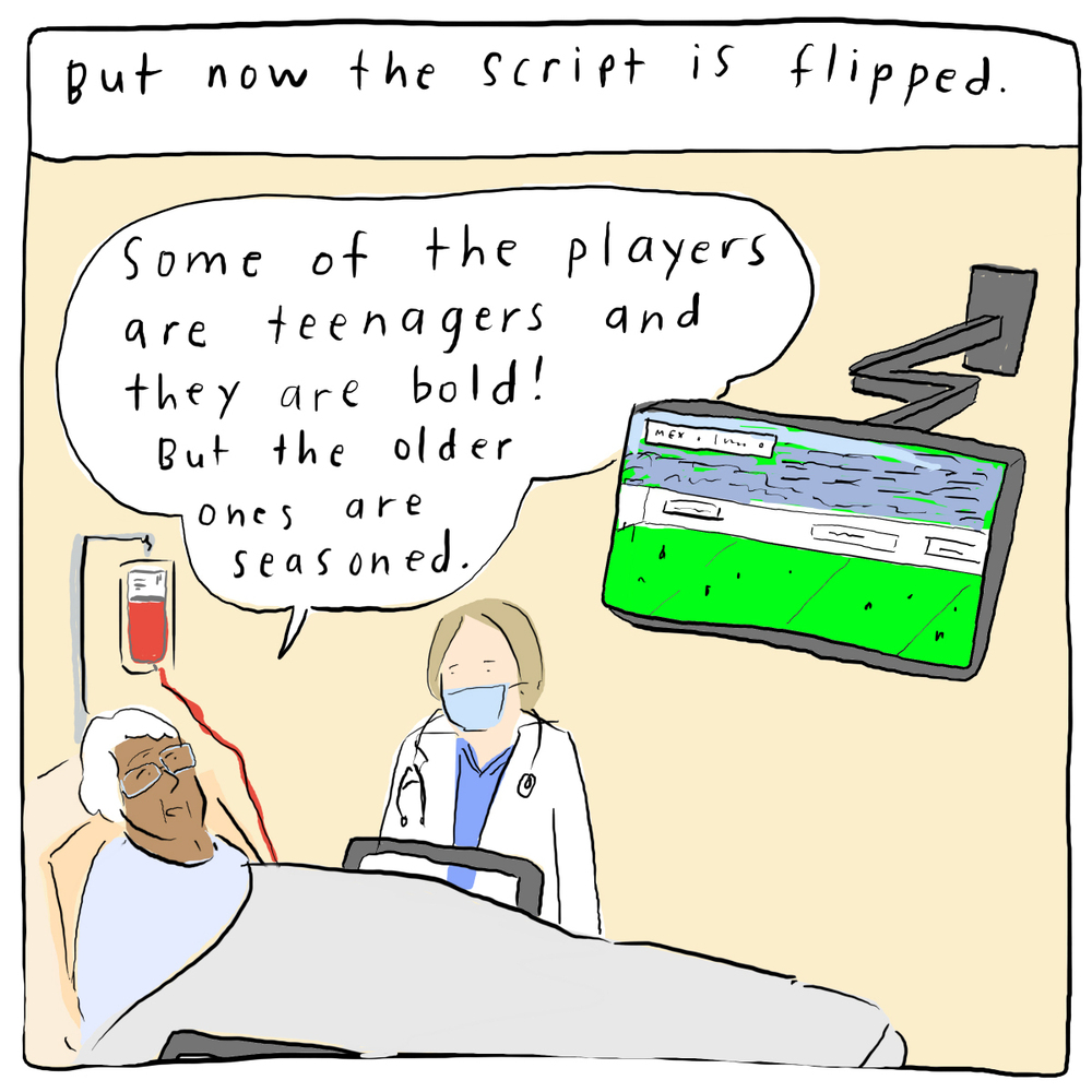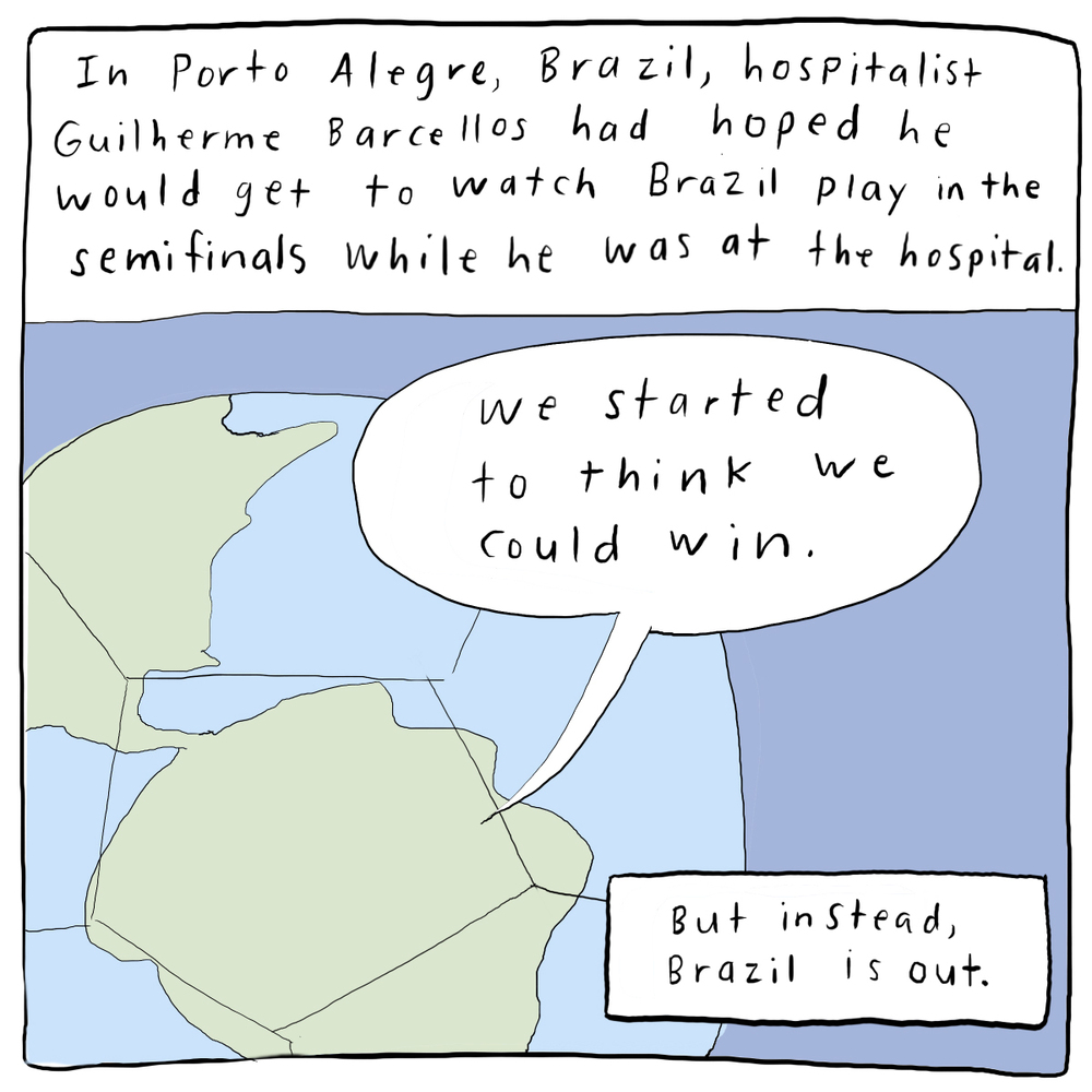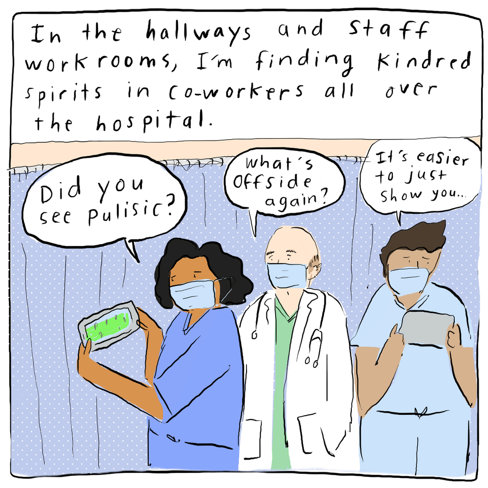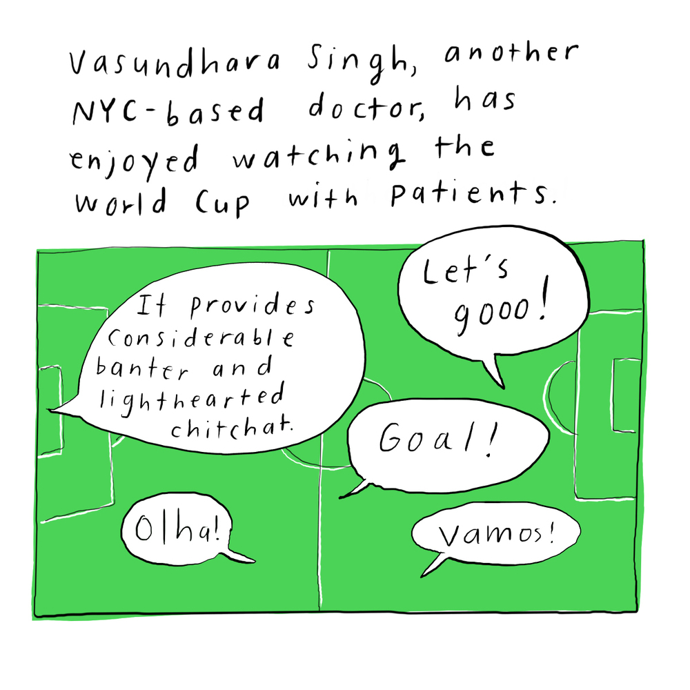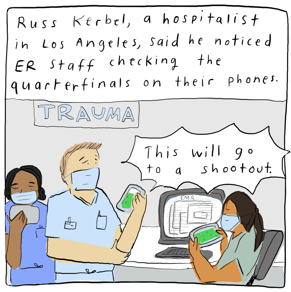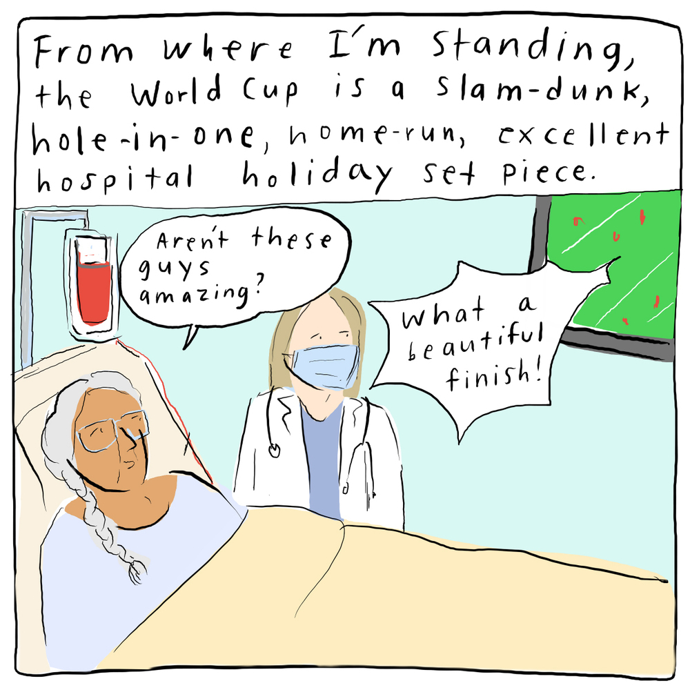 Hospitals can be lonely places as the days grow cold and long — especially during the holidays, and especially during a third pandemic winter. But this year cartoonist and physician Grace Farris, who works as a hospitalist in Austin, Texas was surprised and delighted to find her patients and colleagues rallying around a new sort of holiday spirit and connection — sparked by this month's World Cup soccer play-offs.