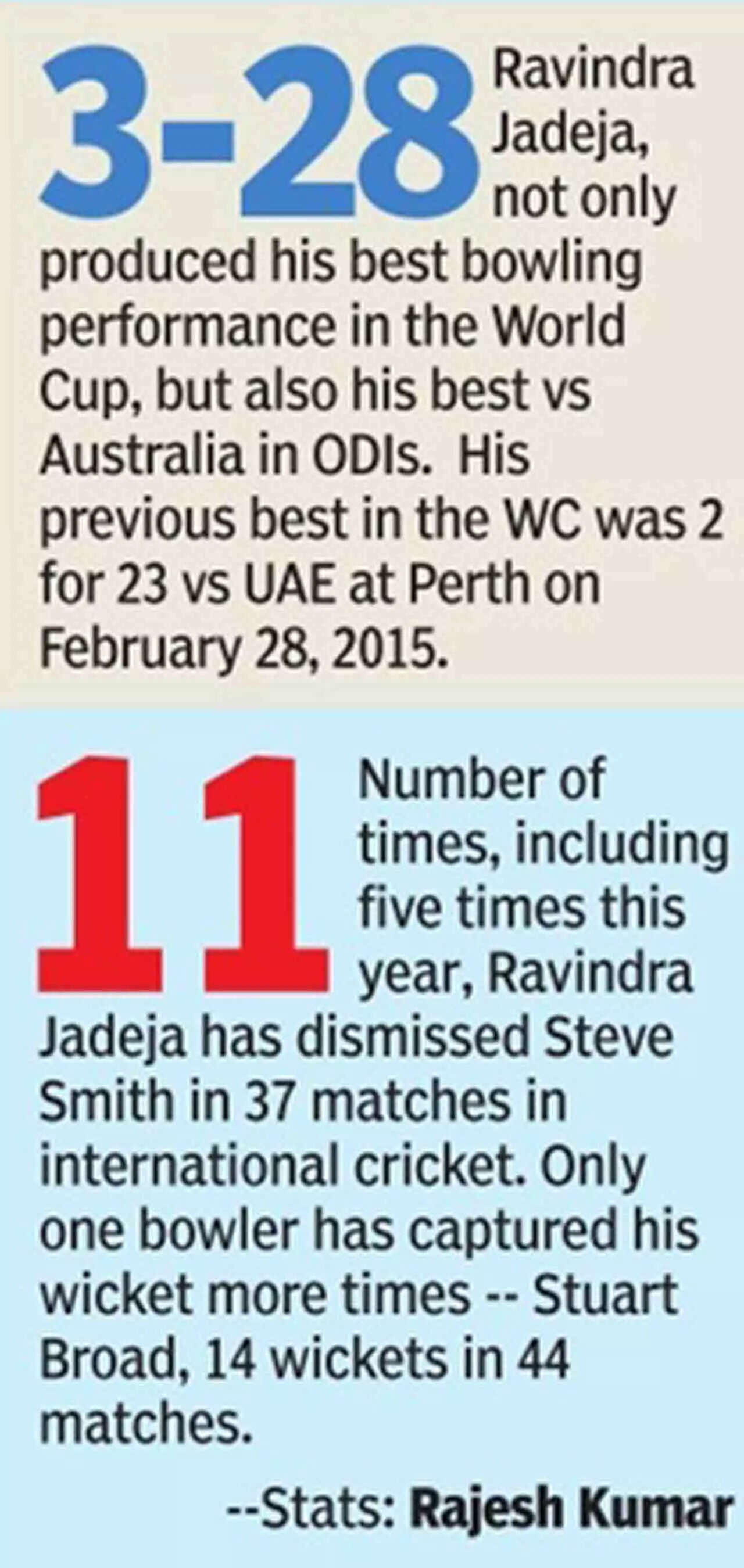 <p>Spinner Ravindra Jadeja returned figures of 3-28 to help bowl out Australia for 199 in 49.3 overs in the 150th ODI meeting between the two cricket giants.<br /></p>AP5/10:Starc sends back Ishan early