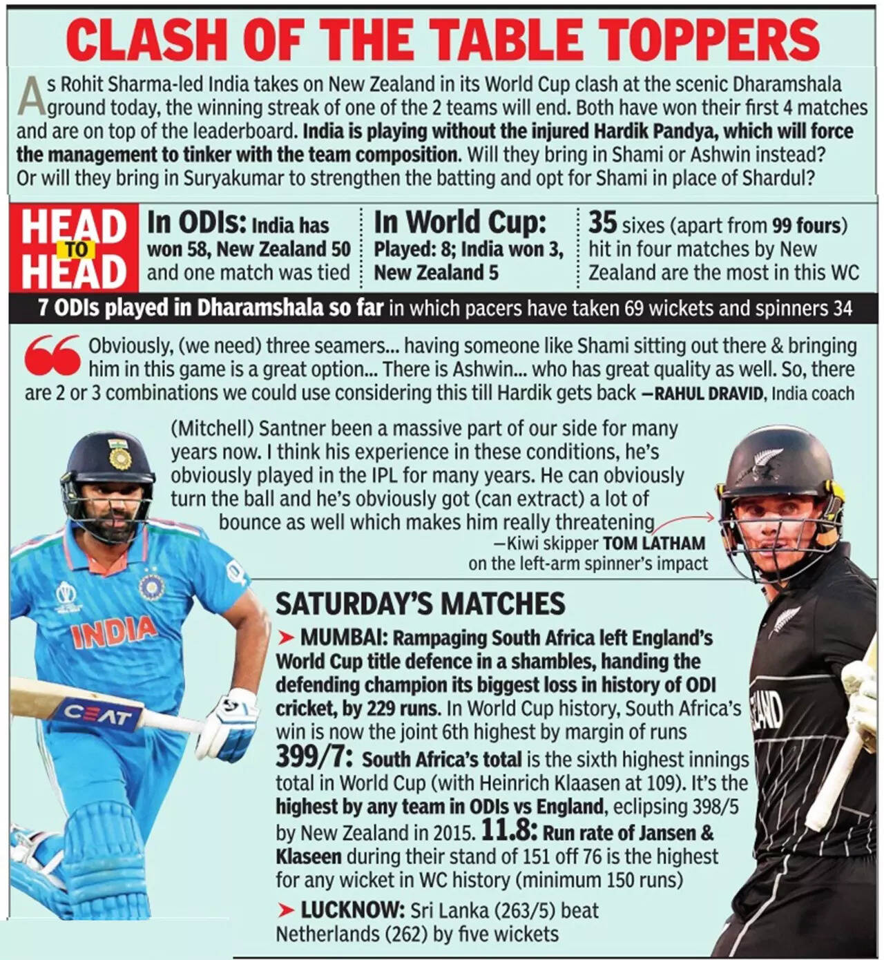 This may turn into a battle of the two captains, then, although expect the pacers to play a more upfront role in Dharamshala. In the WC games here, pacers have taken 33 of the 50 wickets to fall. For New Zealand, Trent Boult is key. Lockie Ferguson is indispensable. Tim Southee is also available for selection.