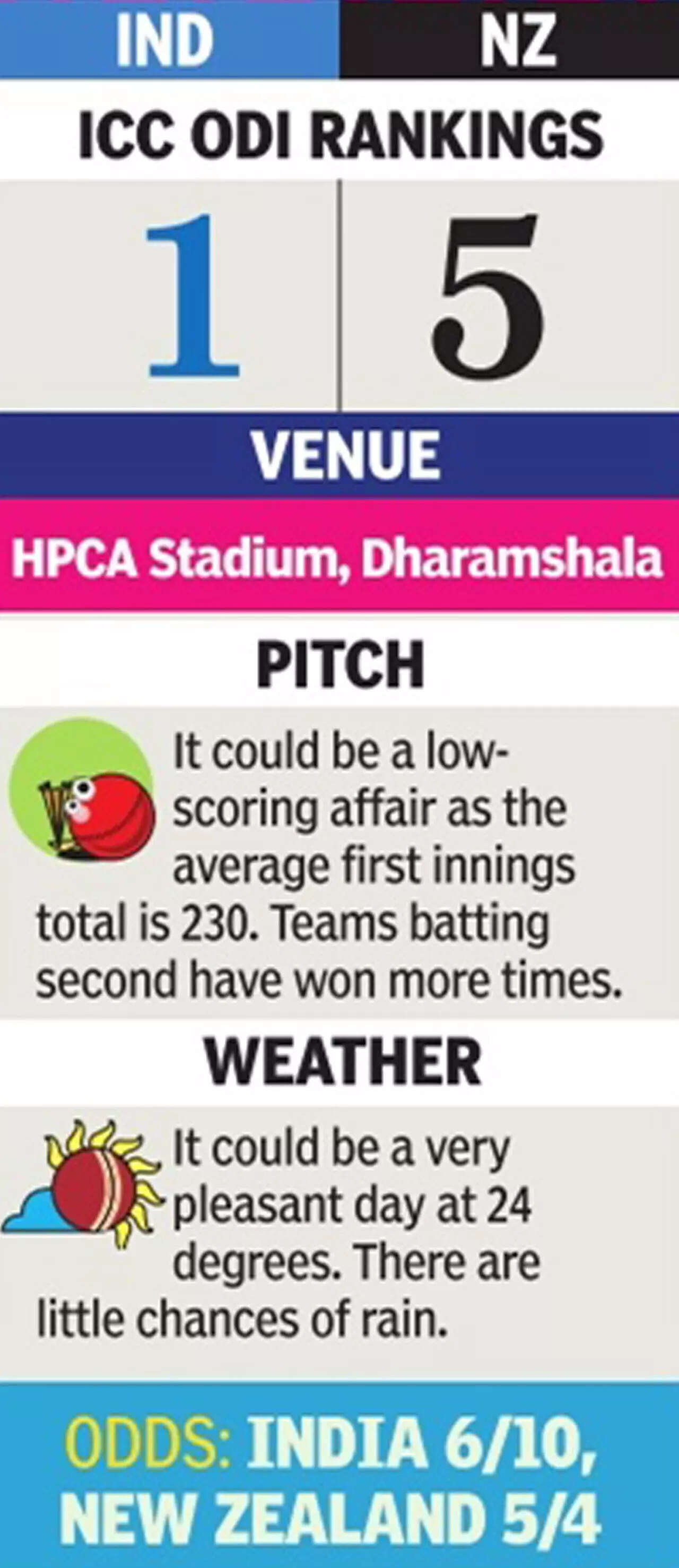 Which brings us to this charming cricket ground nestled in the shadows of the Dhauladhar range, with its tricky pitch and average outfield. There's a sharp nip in the air, the likelihood of dew, the prospect of generous swing and some strikingly short square boundaries. Four out of the seven ODIs here have been won by the chasing side, which has also won the toss each time.