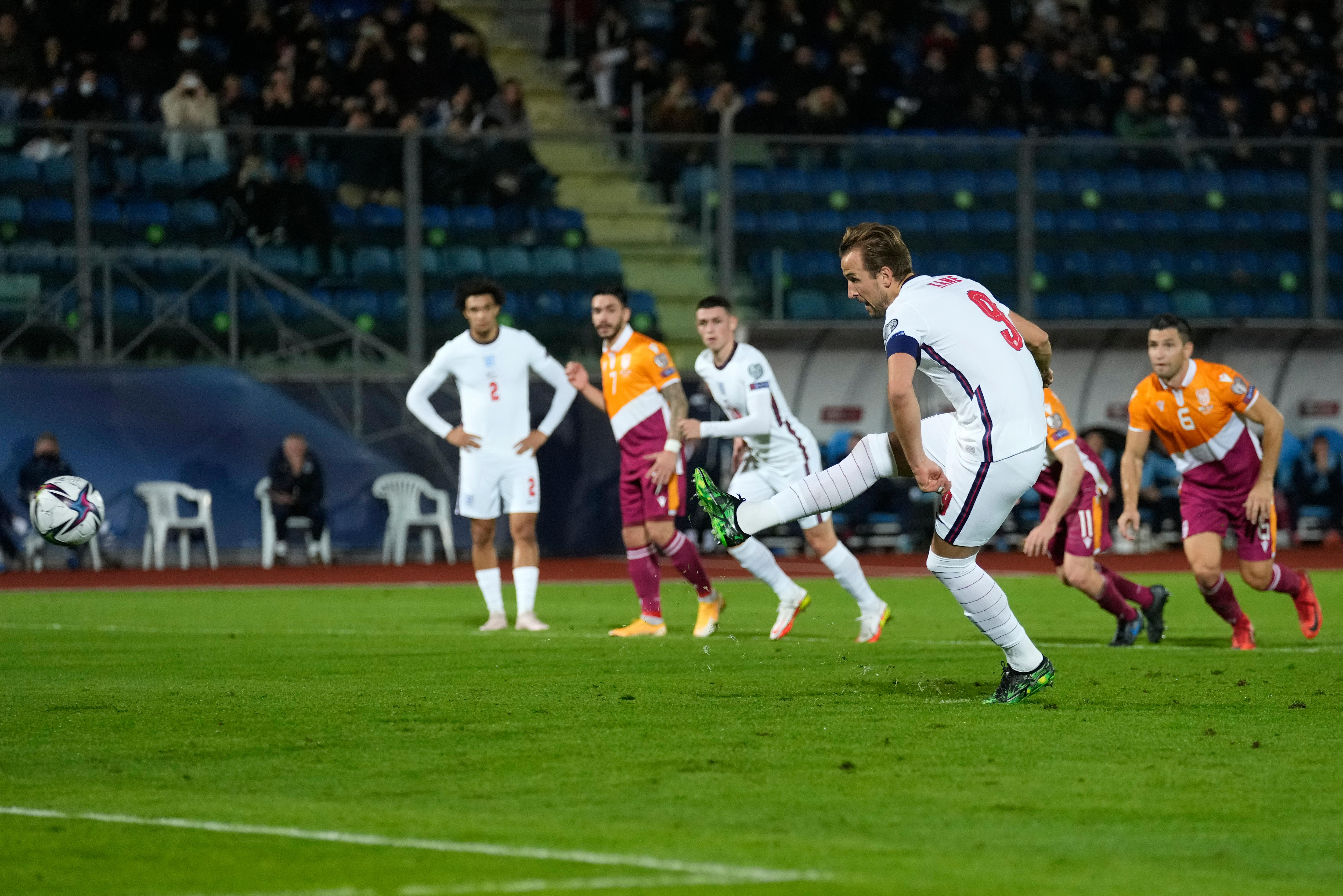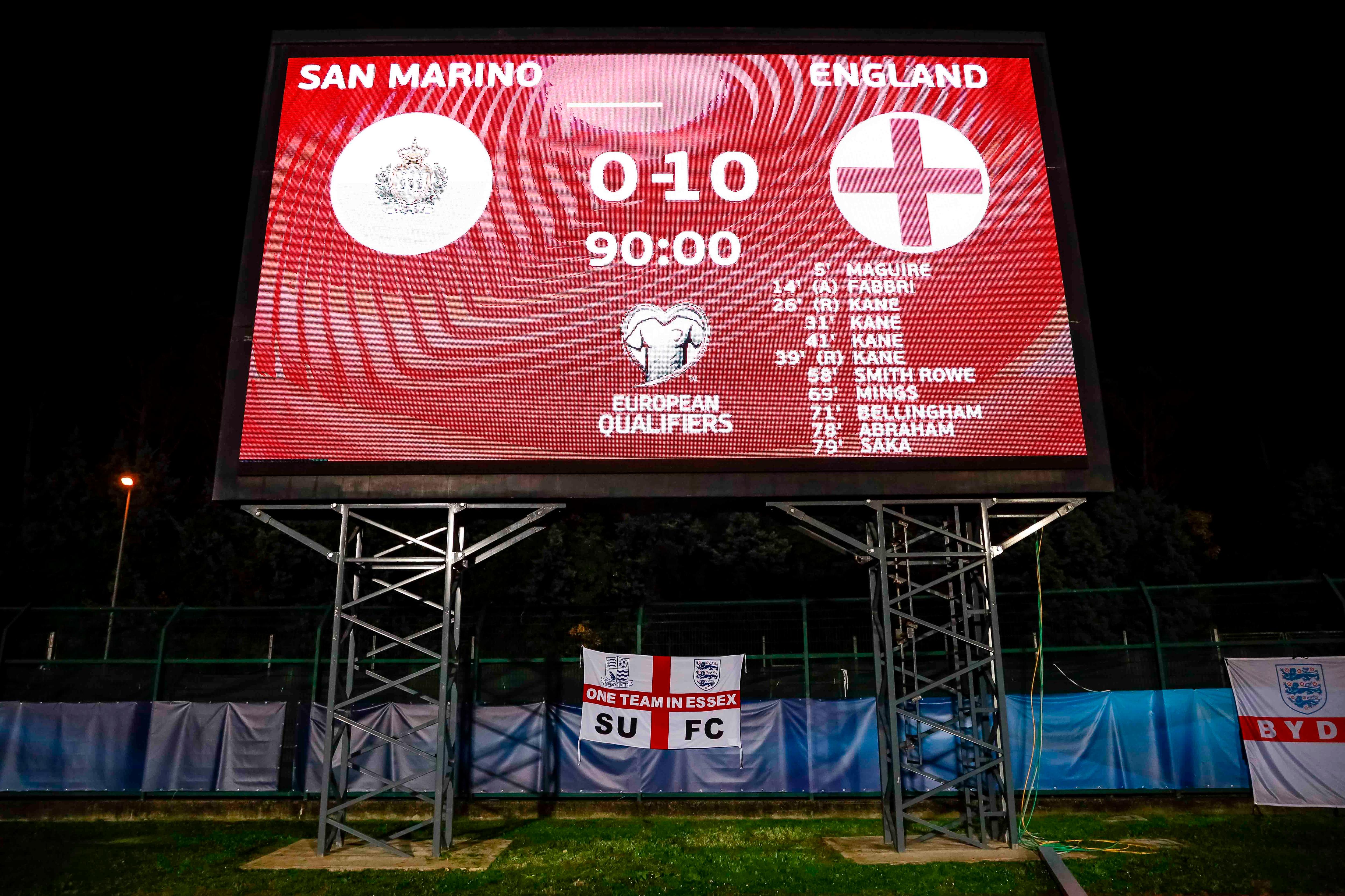 Harry Maguire, Emile Smith Rowe, Tyrone Mings, Tammy Abraham and Bukayo Saka joined Kane in scoring for England, while there was also an own goal by San Marino, the world’s lowest-ranked team, whose line-up was filled with non-professionals using annual leave from their day jobs to play in the qualifier.