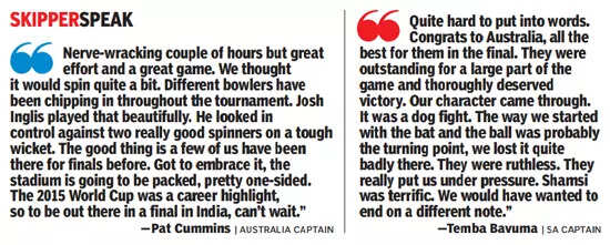 The start to Australia’s innings was in contrast to South Africa’s as David Warner and Travis Head pounced on the Proteas pacers like two-headed dragon, pounding 60 in six overs. That allowed the later batters enough cushion to play with caution.