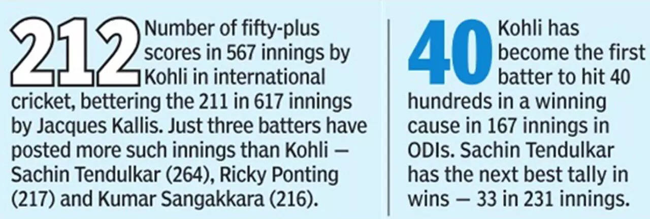 <p>Virat Kohli became the first batter to hit 40 hundreds in a winning cause in 167 innings in ODIs. Sachin Tendulkar has the next best tally in wins — 33 in 231 innings. </p>PTI8/10:ODI record