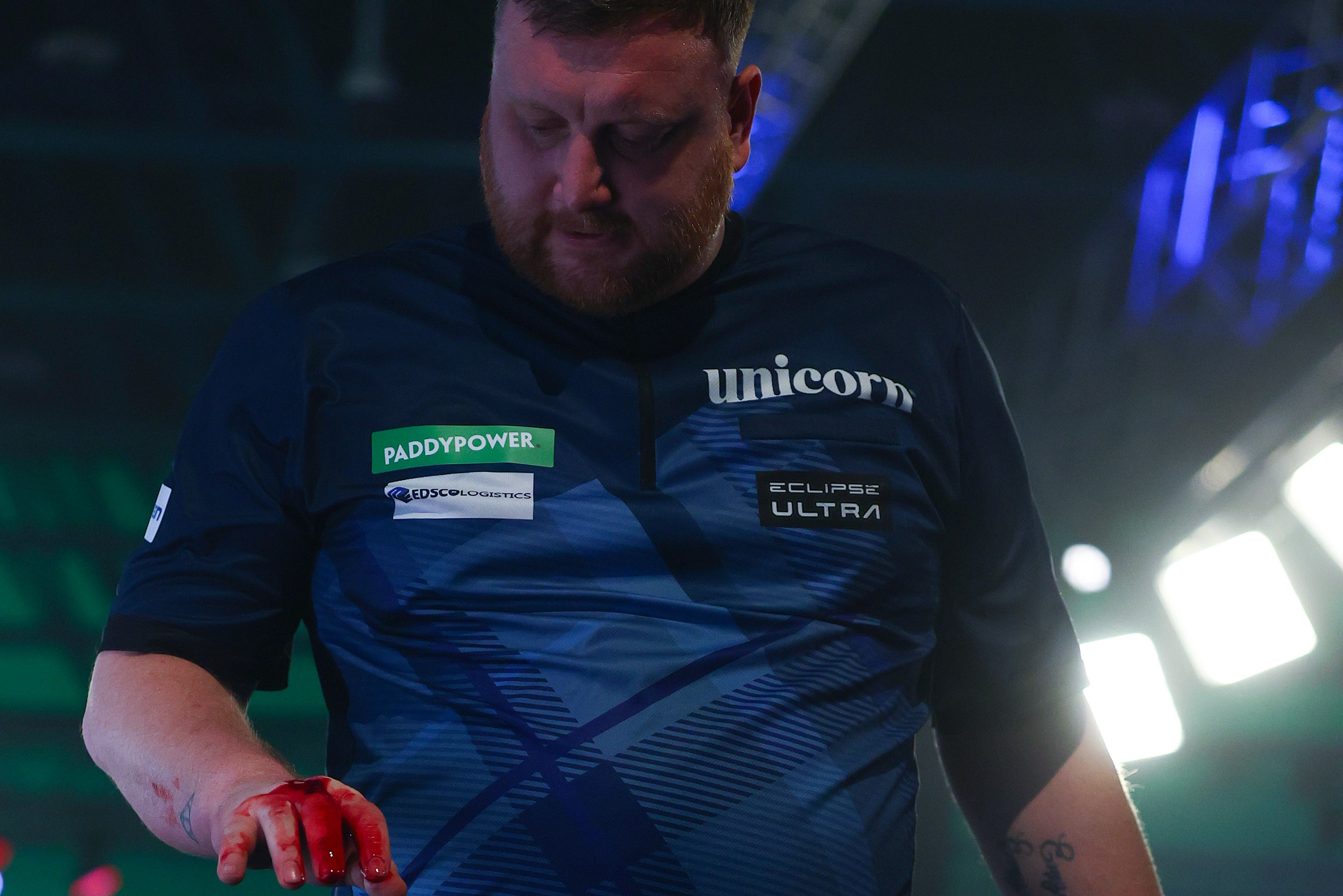 Cameron Menzies drew blood from his right hand after punching a table in anger following a shock first-round defeat to England’s Charlie Manby in the World Darts Championship at Alexandra Palace.