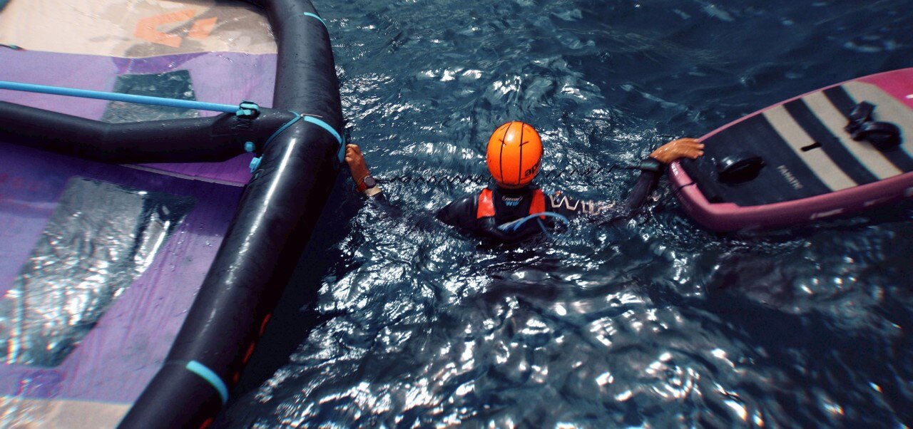 He drifted in the water, contemplating what to do next, when all of a sudden the wind picked up and carried him to the finish line: he had made it.