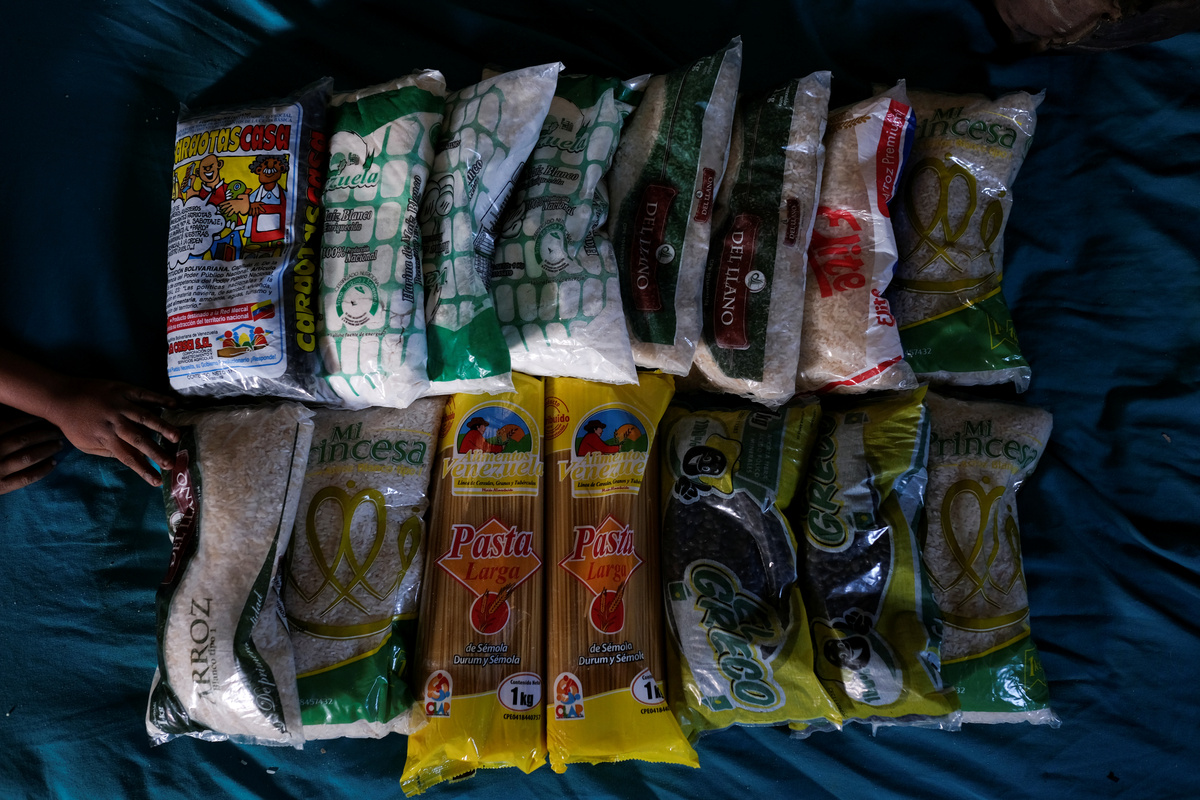 Since Venezuela's schools are closed due to the coronavirus pandemic, parents or teachers picked up the monthly rations - which consist of 6 kg (13 pounds) of rice, 4 kg (9 pounds) of lentils, 454 grams (1 pound) of salt and one liter (2 pints) of vegetable oil - on their behalf, according to Susana Rico, the WFP's Venezuela representative.