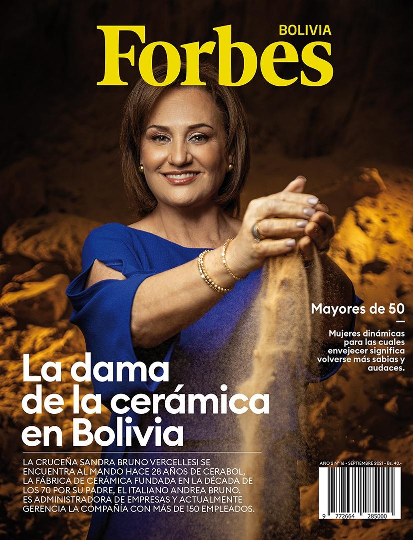 Sandra Bruno, 58, is the face of Forbes Bolivia’s package spotlighting successful women over the age of 50. Since her father’s death in 1993, she has run the family business, Cerabol, considered the country’s pioneer in ceramic tile.