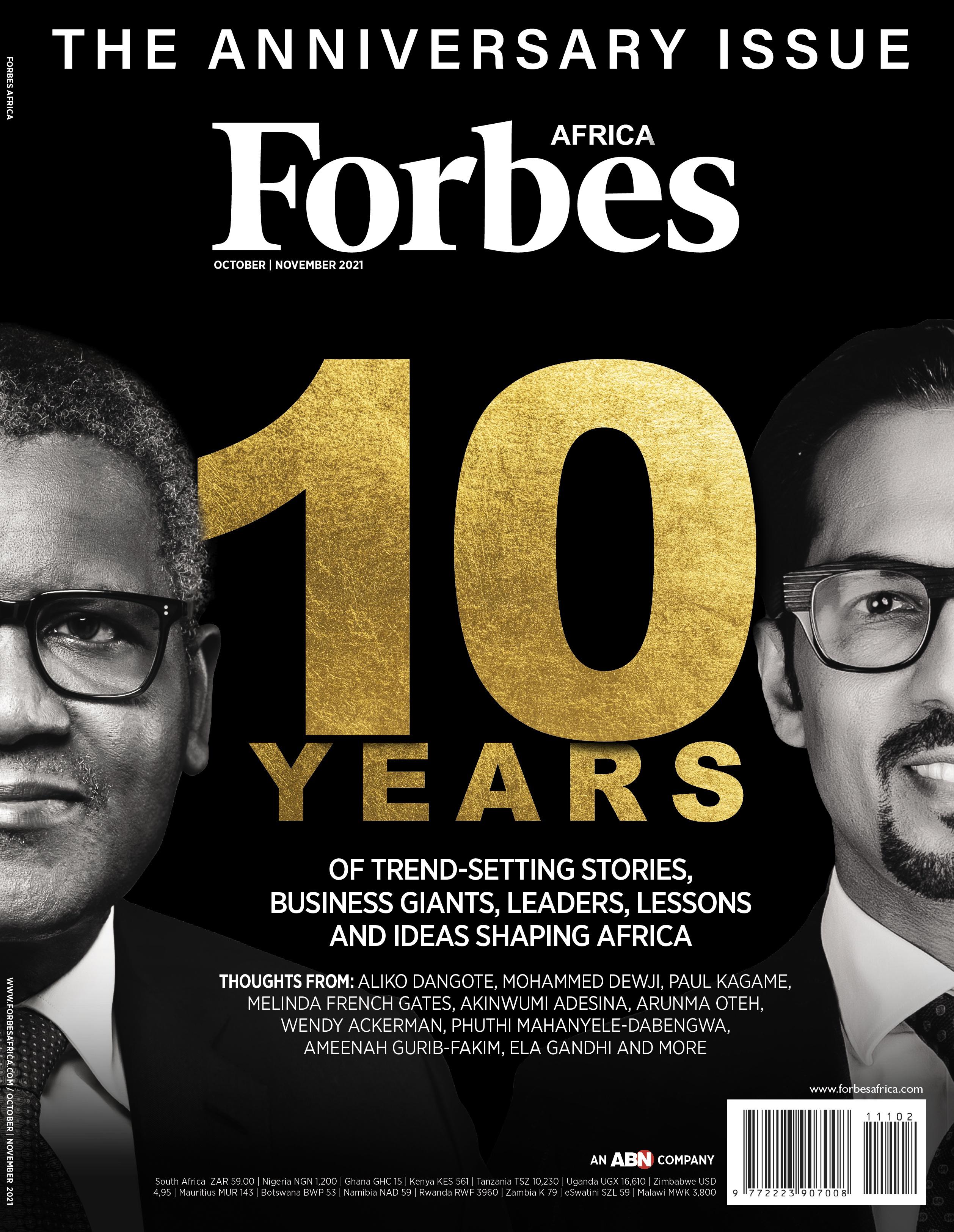 Aliko Dangote (pictured far left) has amassed a $13 billion fortune from Dangote Group, his cement, salt and sugar conglomerate. The richest African appears for a sixth time on the cover of Forbes Africa, this its 10th-anniversary issue.