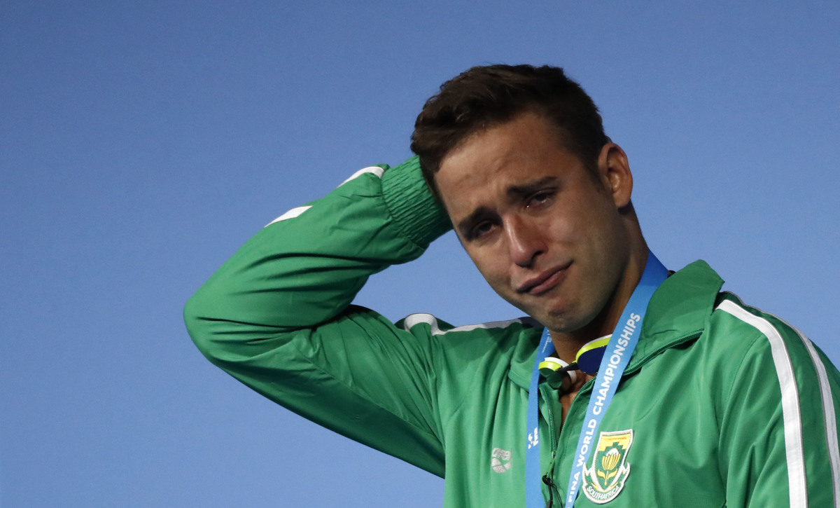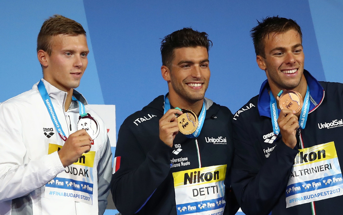 On a glittering night for Italy, Gabriele Detti won his first world title in a close finish in the men's 800m freestyle, an emotional Chad le Clos of South Africa took gold in the men's 200m butterfly and Britain's Adam Peaty secured a breaststroke double with 50m gold.