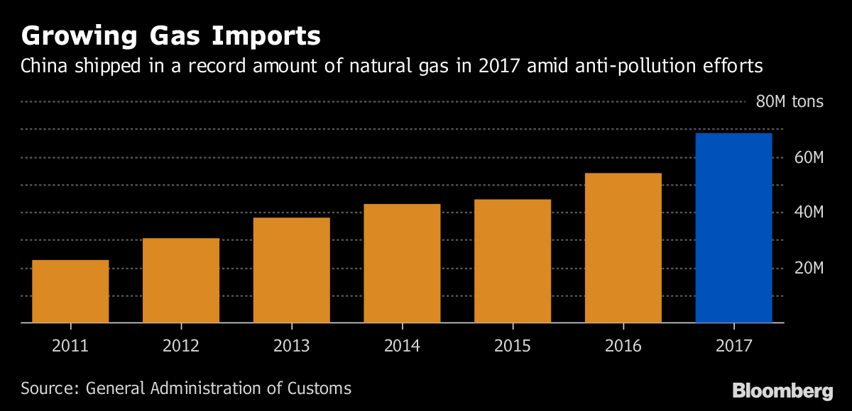 Purchases of less-polluting ore is only one tactic in China’s war against pollution. Another is curbing coal use and encouraging the use of cleaner natural gas instead. Imports of the fuel via both sea and pipeline surged almost 27 percent to 68.57 million tons in 2017.