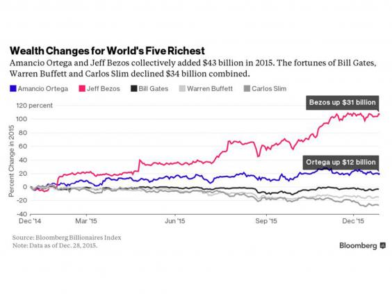 The biggest loser was Carlos Slim, whose Mexican telecommunications company American Movil declined 25 per cent in 2015. Slim fell to fifth place after regulatory efforts to break apart his business cost him $20 billion.