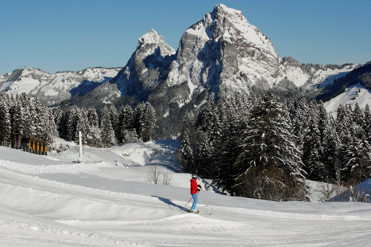A skier in front of mount Grosser Mythen (1,898 m/6,227 ft above sea level) and the barrel-shaped carriages of a new funicular line are seen during sunny winter weather on a piste in Stoos, Switzerland December 13, 2017. Picture taken on December 13, 2017. REUTERS/Arnd Wiegmann