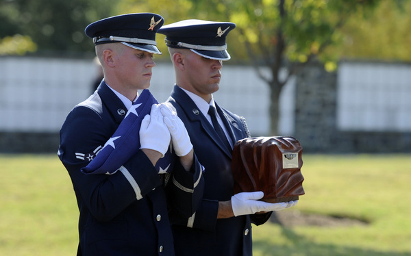 On Wednesday, Harmon's ashes were taken from a shelf in her daughter's closet and carried by an honor guard to a spot in the southeast corner of the cemetery. World War II era planes flew overhead.